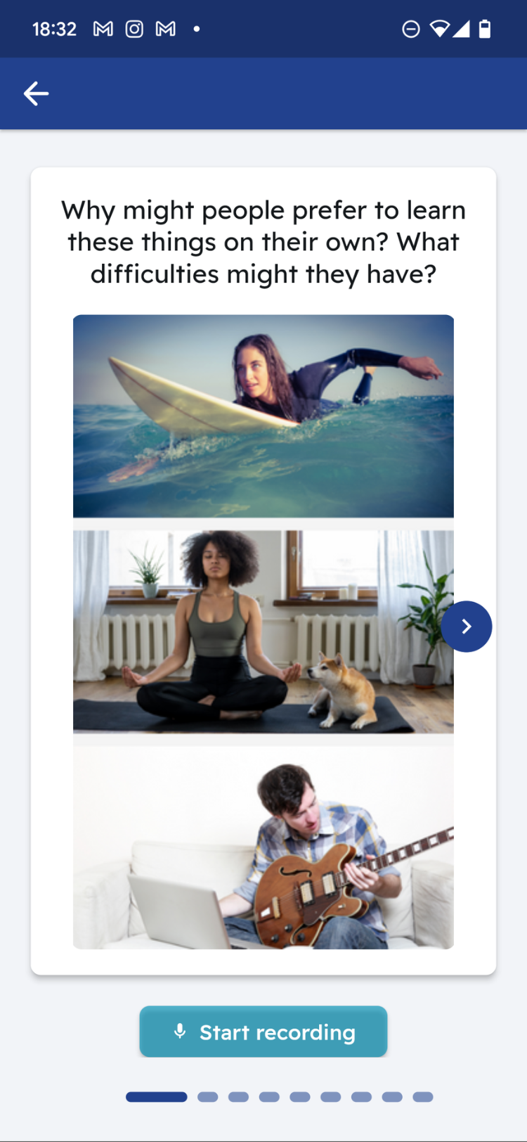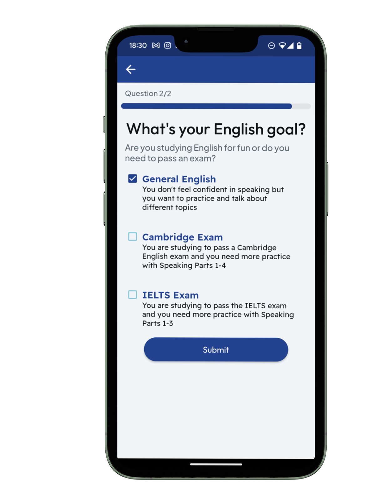 Pass your speaking exam with ease! Respond to thousands of tailored questions for Cambridge B1 Prelimary, B2 First, C1 Advanced, C2 Proficiency and IELTS